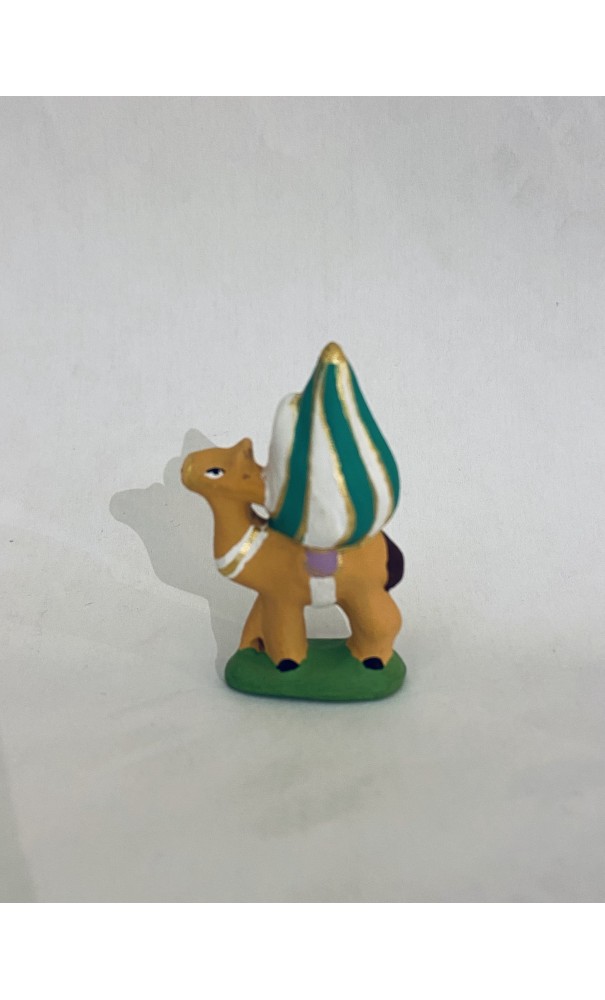Chameau au bassour vert, santon Filippi PUCES en terre crue, peint à la main.