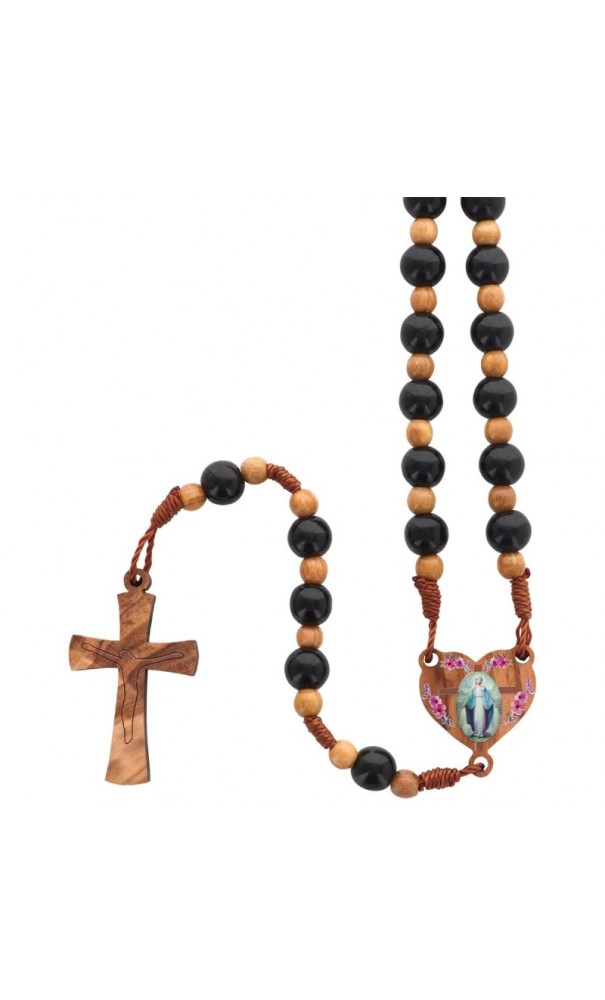 Coeur: Médaille résine de la Vierge Miraculeuse collée sur un coeur en bois agrémenté de motifs floraux. Dim: 2 x 2,2 cm.