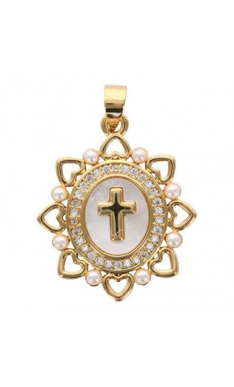 Médaille et croix métal doré supérieur avec coquille naturelle, grains nacres blancs et zircons