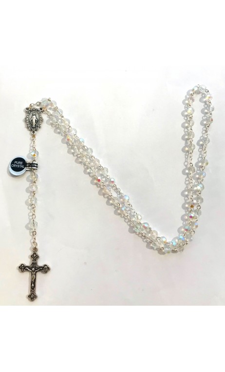 Chapelet verre blanc chaîne métal argenté, Pater petites fleurs métal