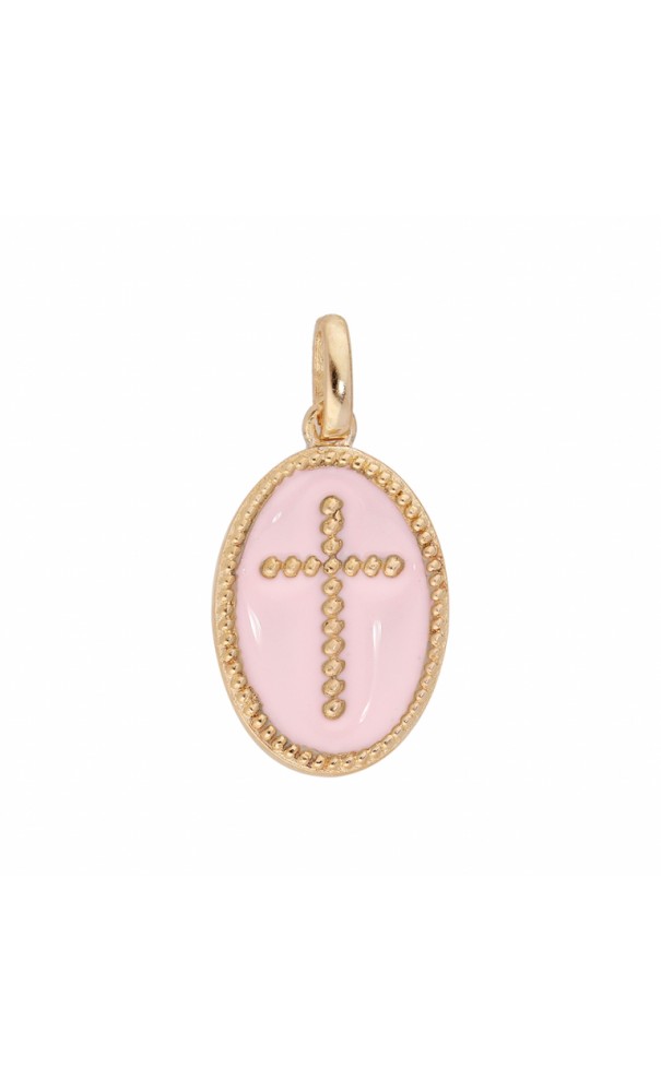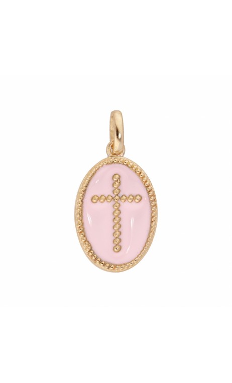 Pendentif croix plaqué-or sur ovale en résine rose pastel