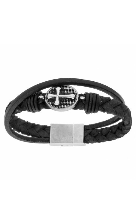Bracelet cuir bovin tressé noir avec croix acier patiné