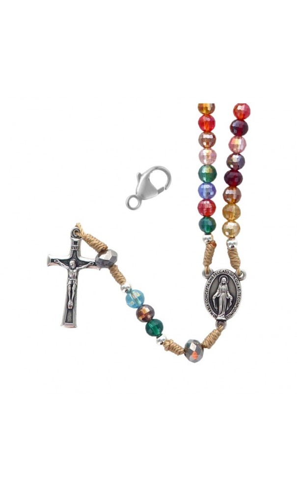 Chapelet multicolore simili cristal sur corde et croix métal argenté