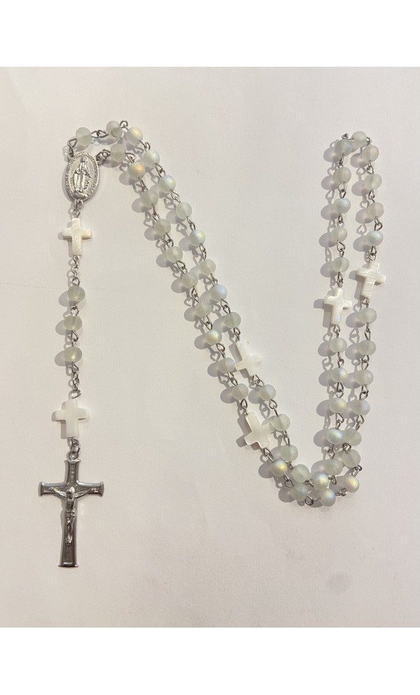 Un chapelet élégant aux perles faciles à égrener monté sur métal argenté. Pater en forme de petites croix en nacre blanche.