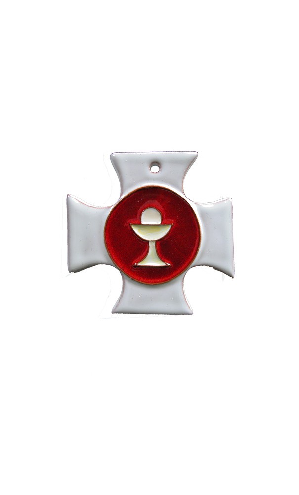 Croix murale carrée blanche petit modèle en céramique calice et hostie sur fond rouge. Atelier Le Becel