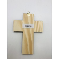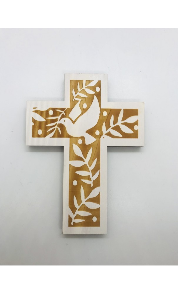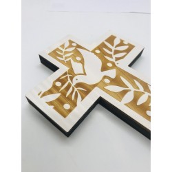 Un crucifix sobre et moderne en bois et feuilles de palmier découpé formant un motif colombe et olivier.
