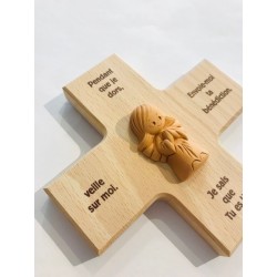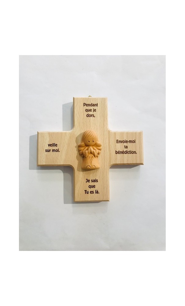 Croix murale en bois carrée avec ange en terre cuite et prières