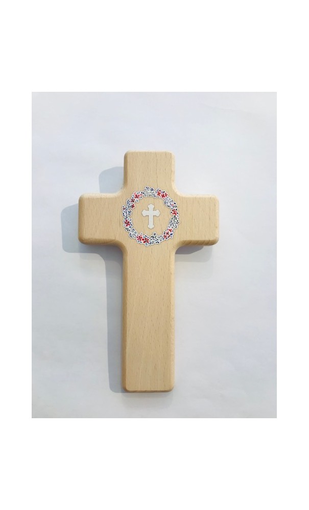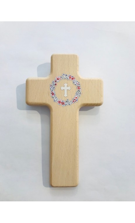 Croix murale bois impression fleurs et croix