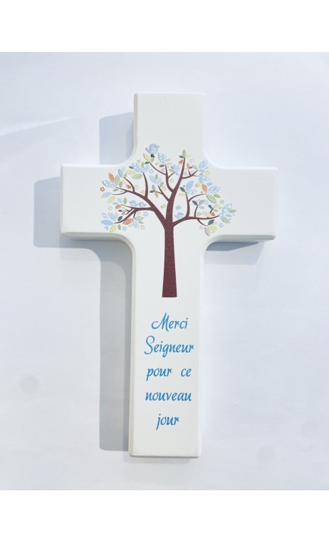 Croix en bois de hêtre peint "Chaque jour" (arbre de vie rose)