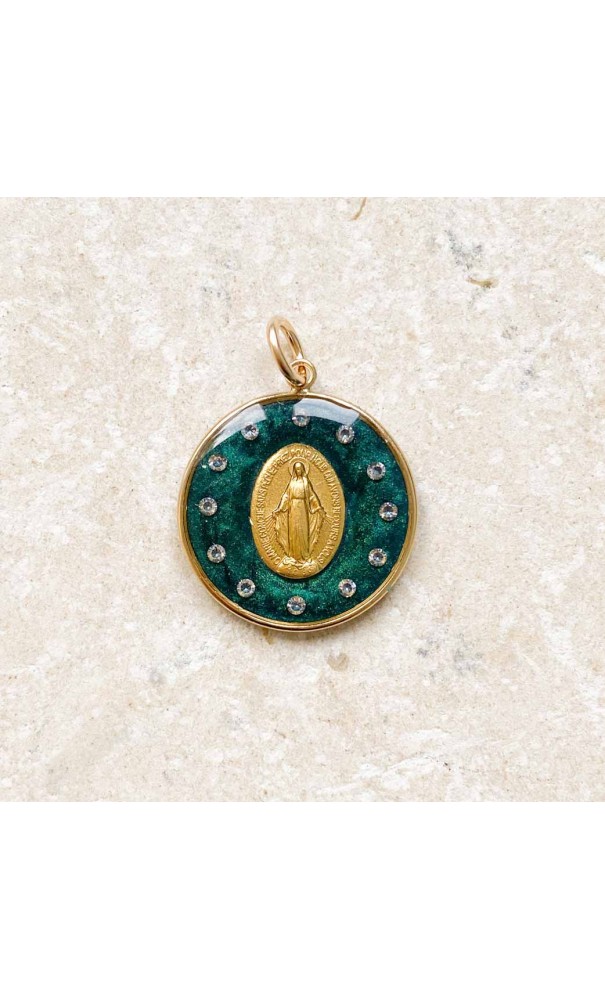 Anneau en gold filled, médaille miraculeuse de la rue du Bac dorée, mica vert émeraude et douze brillants.