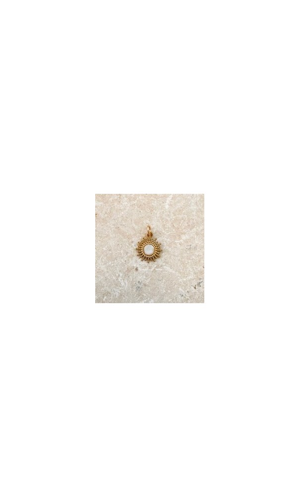 Médaille ostensoir en acier doré, environ 14 mm de diamètre, cœur en mica nacré blanc.