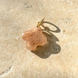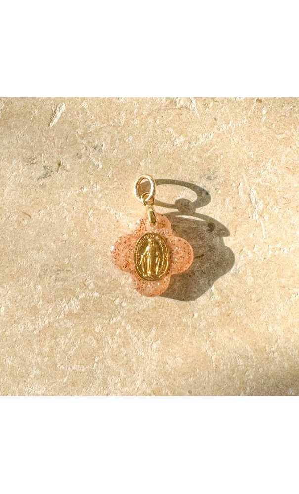 Croix quadrilobée 1,5 x 1,5 cm en résine, sable, et paillettes entourant la médaille de la Rue du Bac. La médaille est visible sur un seul côté.