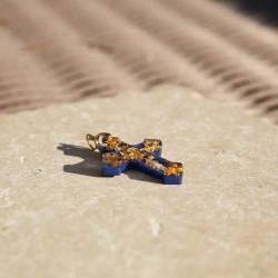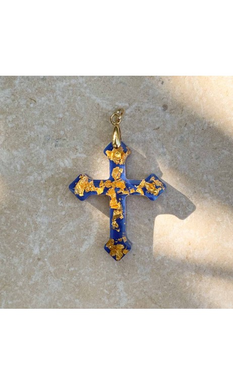 Croix en résine et mica bleu, feuille d'or 24 carats.