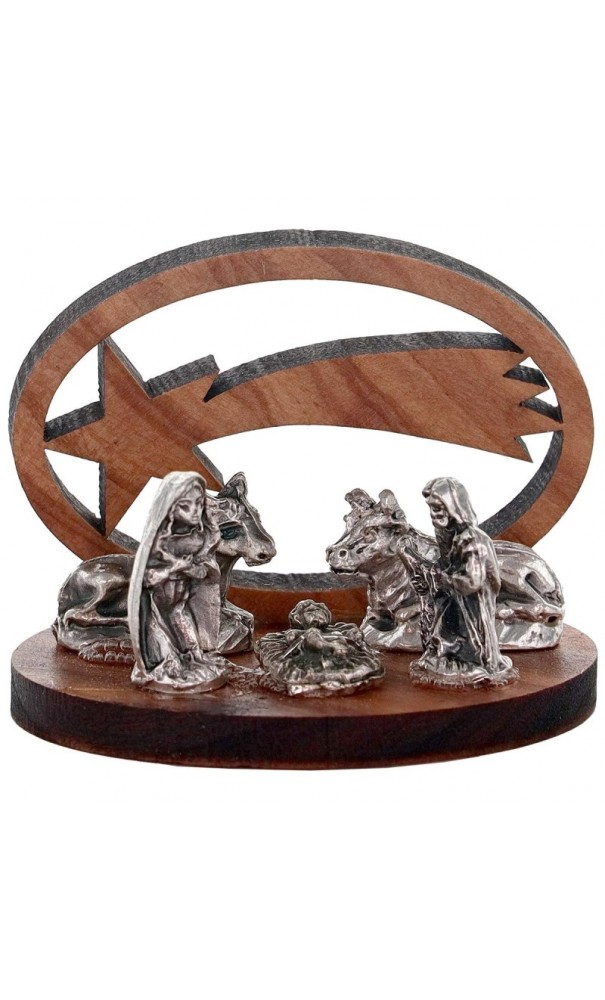 Mini-crèche sur socle en bois, fond étoile, personnages métal 3,5 cm