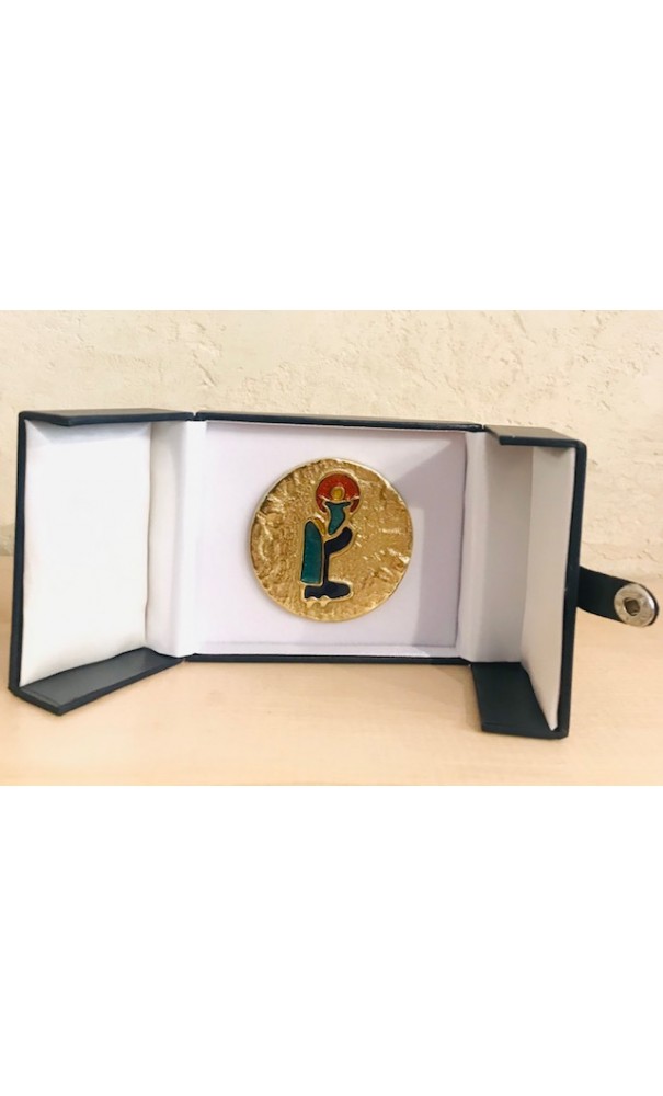 Ouvert, ce mini-autel de poche nous permettra de prier face à un médaillon stylisé de la Vierge à l'Enfant en bronze et émaux.