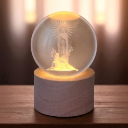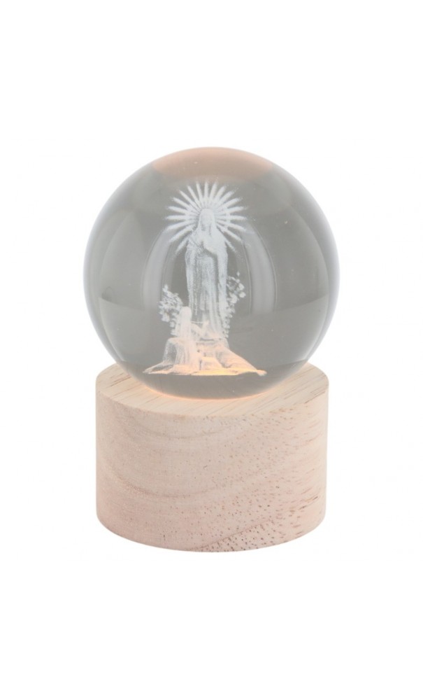 Boule en verre lumineuse Notre Dame de Lourdes sur socle en bois