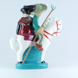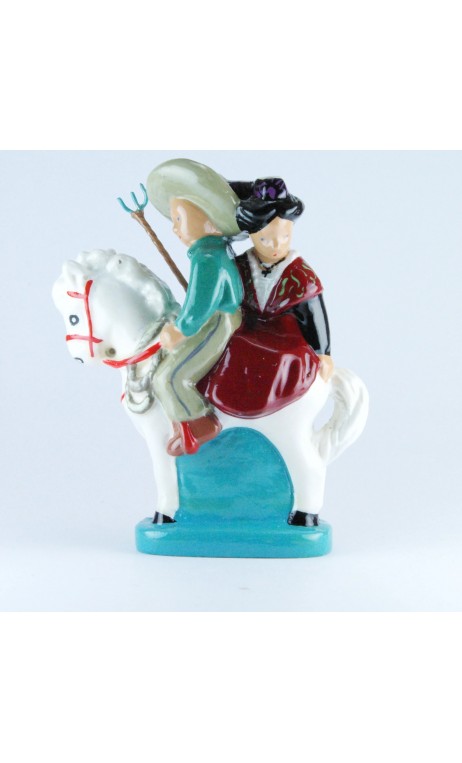 Le gardian et l'Arlésienne en jube rouge et corsage noir sont à cheval.