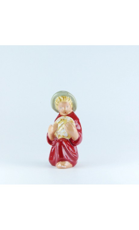 Ce petit berger à genoux offre un agneau devant la crèche.