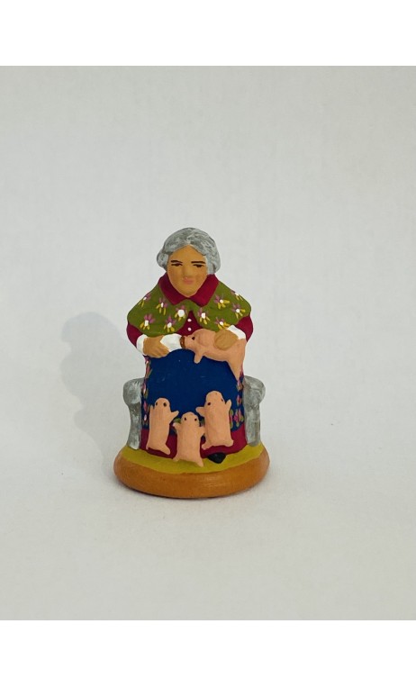 Tante Rose et ses porcelets (tablier bleu, châle vert), santon Fouque 4cm (Nouveauté 2025)