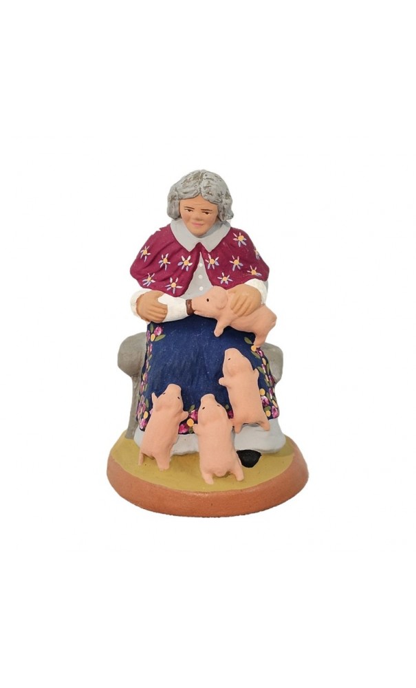 Tante Rose et ses porcelets (tablier bleu, châle bordeaux), santon Fouque 6cm (Nouveauté 2025)